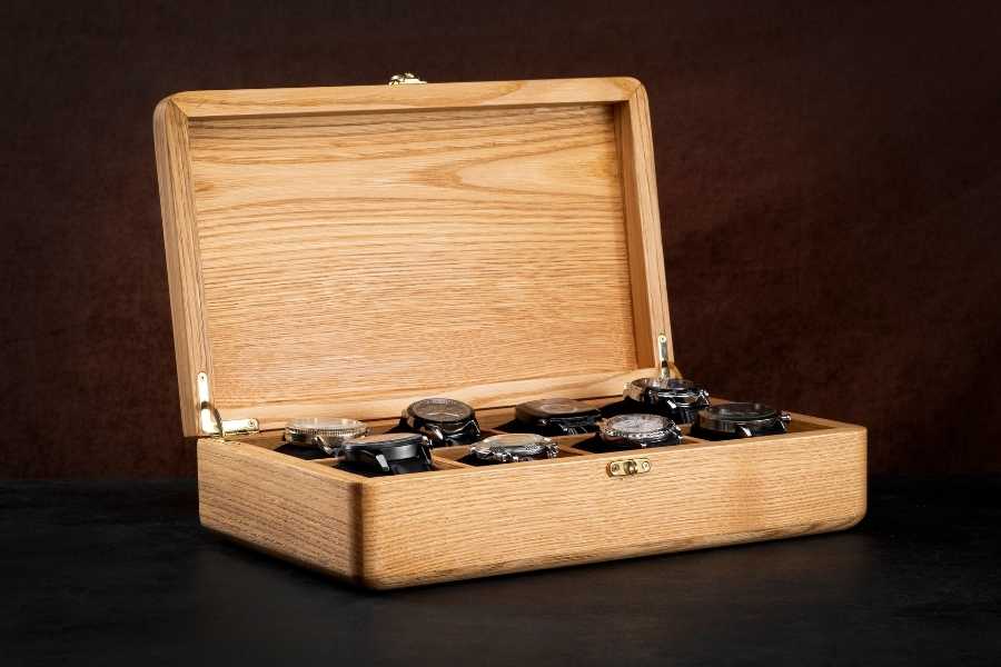Completely handmade using natural solid chestnut wood that will accompany you for many years, this luxury handmade watch box has 8 separate watch slots and free handmade fabric cushions to organize, display and store your watches.