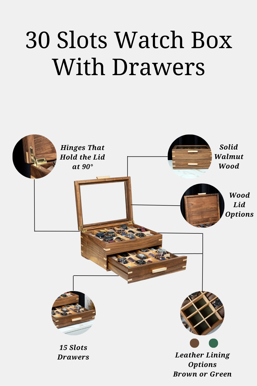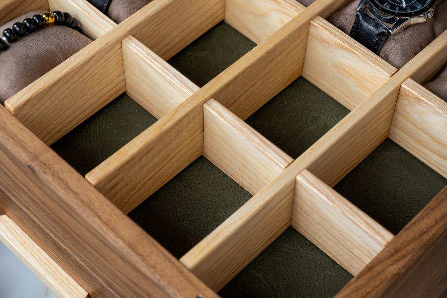Meet our elegant walnut watch box with drawer, meticulously crafted to house your valuable watches in style. The watch case made of solid walnut wood is a testament to fine craftsmanship and timeless elegance. With its capacity to store 30 watches, the watch box for men is perfect for discerning collectors and enthusiasts alike. For added protection, choose our leather lining that will add style to your mens watch box while protecting your watches from scratches. Upgrade your collection with the watch display case, where craftsmanship meets finesse.