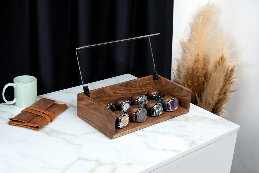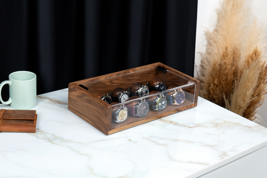 Whether you're a watch enthusiast looking to organize your collection or searching for the perfect gift, our Handmade Walnut Watch Box for 8 Watches and Acrylic Lid is the ideal choice. Treat yourself or someone special to this exquisite watch box and elevate your watch collection to new heights.