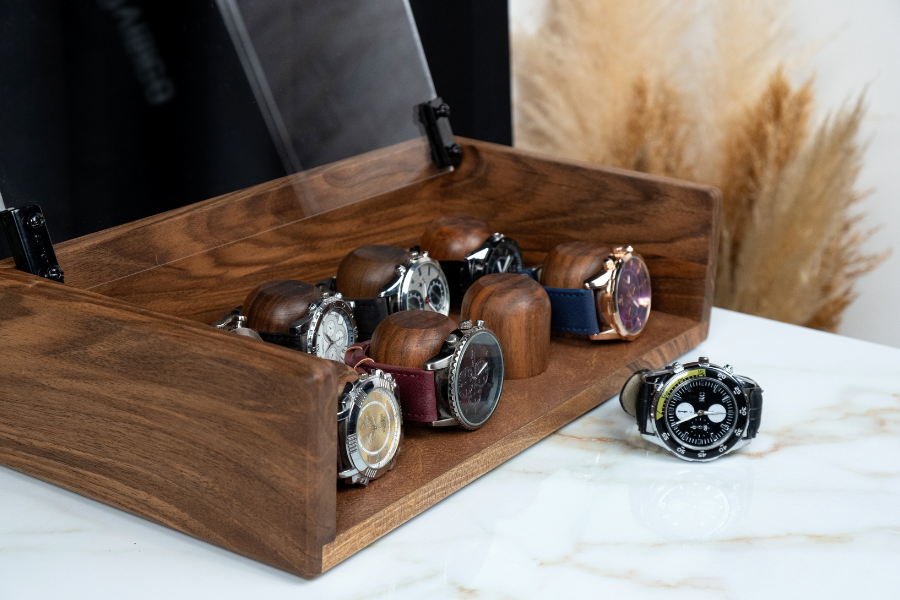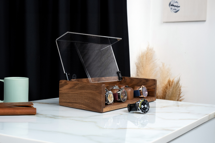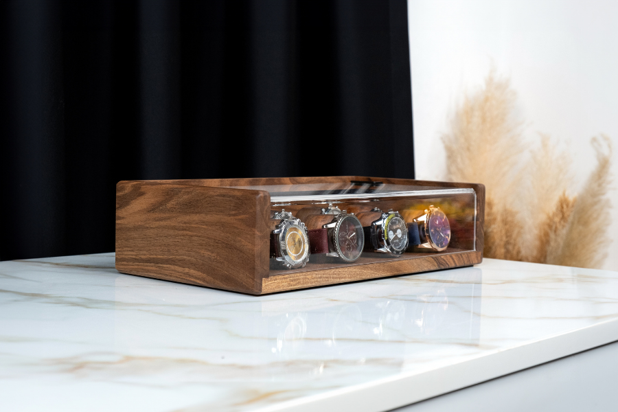 We added our workmanship to the product by beveling all edges of the watch holder. The acrylic cover was bent into a single piece and ovalized, ensuring design integrity throughout the watch boxes. We could cut and use cylindrical pieces of wood for the watch columns of the mens jewelry box, this would be cheaper and easier for us, but in this case the sharp edges could damage your watch. For this reason, we not only protected your watches by making the upper parts of the watch columns round, but also continued our attention and care in every detail of the watch display. In the wooden wood watch box, the acrylic cover does not fall back by leaning back when opened, you can open and close it with one hand. As a result of all this workmanship, a harmonious, stylish and useful watch stand was obtained.