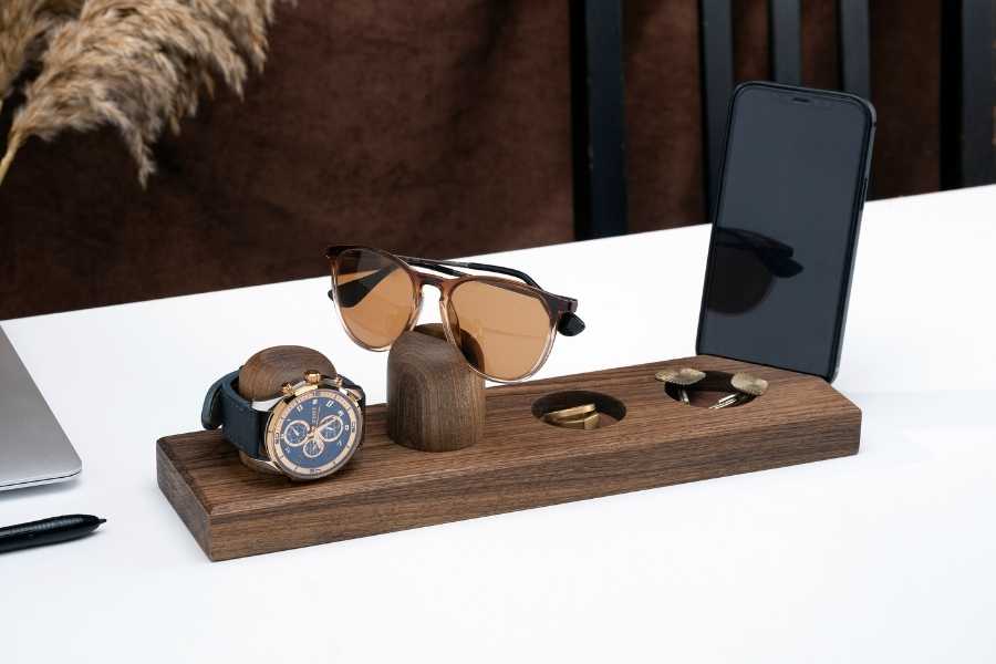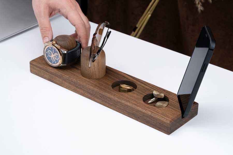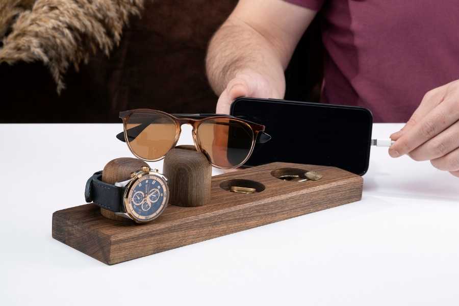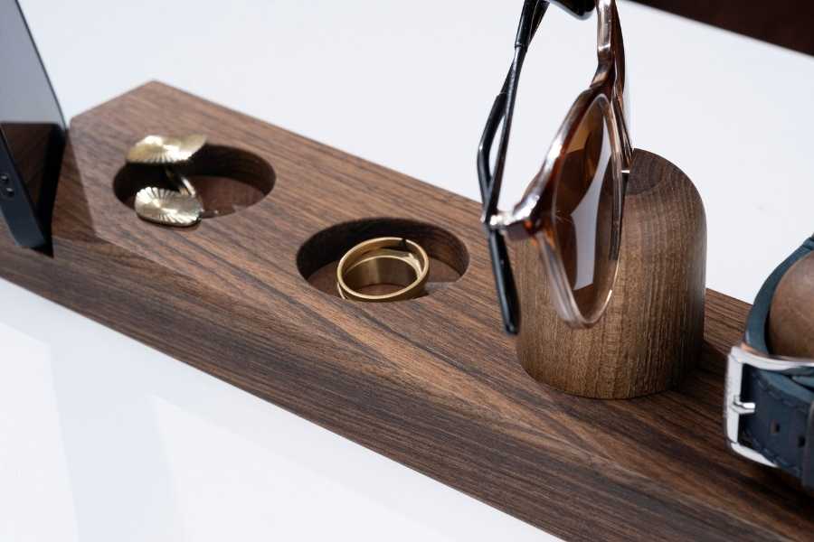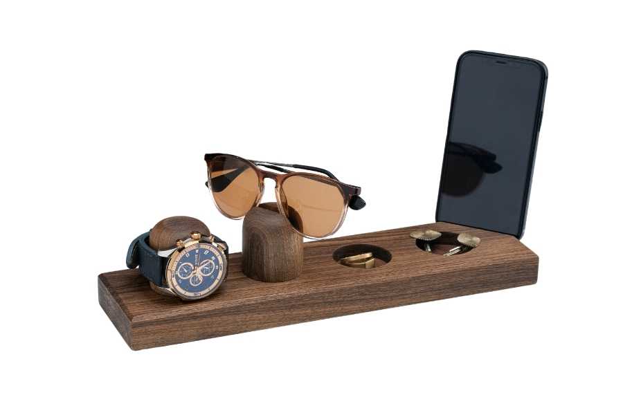 The solid walnut wood docking station has a section for your watch, glasses, daily accessories such as rings, bracelets and keys, and a slot for your mobile phone. Nightstand organizer will be your favorite helpful item on your bedside. Organize your everyday items with elegance and precision.