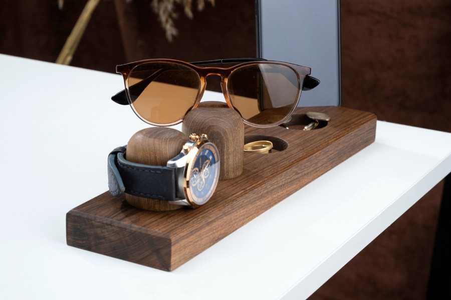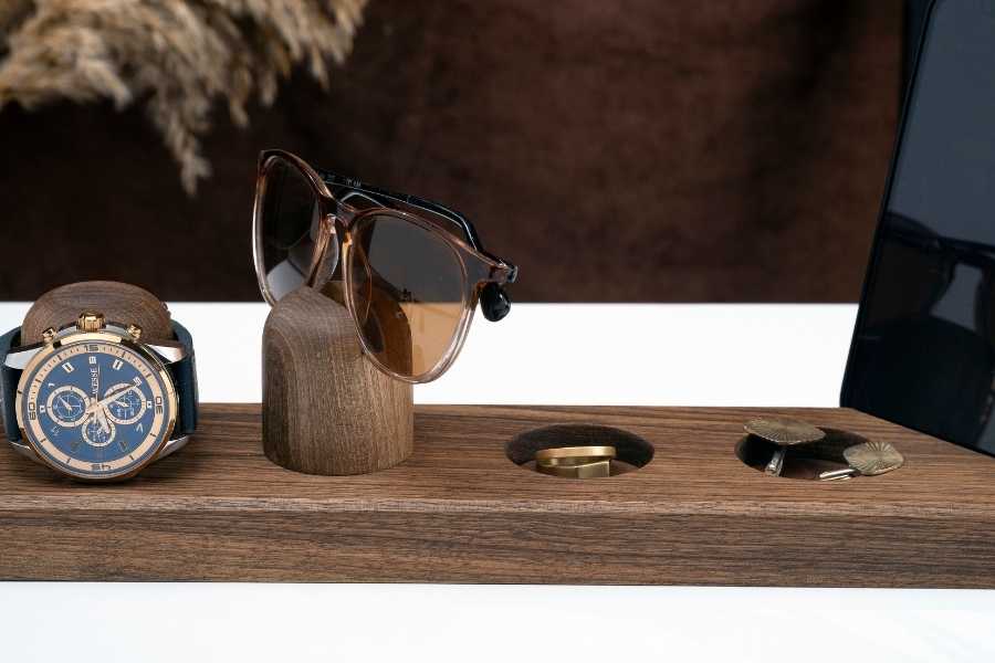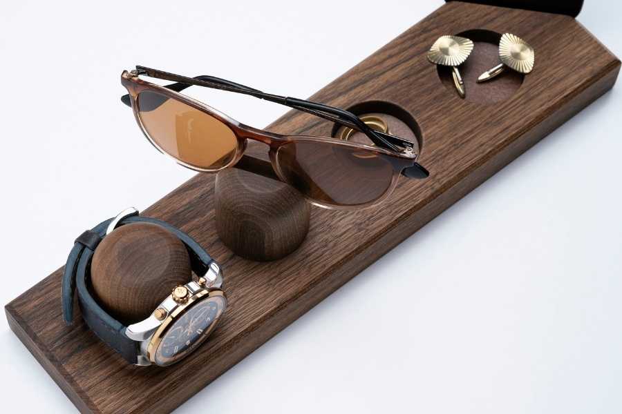 it has a column for your watch, a column for your glasses and two dishes for your daily accessories such as rings, bracelets, tie pins, cuff links, and a slot that allows your mobile phone to stand upright or be charged; It will be exactly the helper and favorite item you are looking for for your nightstand.